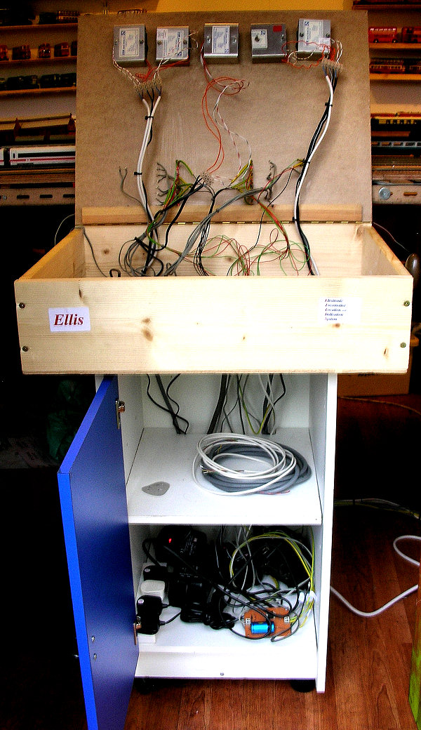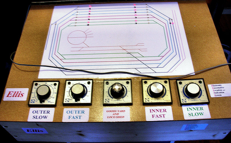 Ellis was made with a hinged lid for easy access to the controllers and wiring. Peco studs are located on a coloured diagrammatic plan of the layout to operate the points and (not yet fitted) toggle switches for platform isolation sections. The mains transformers are on the bottom shelf, making the unit stable. There are 3 Maplin 12 volts 3 amp units, unless they are fully loaded, their output voltage is almost 15 volts, ideal for the Compspeeds. Also, a slightly reduced input voltage gives a much more realistic maximum speed.....after all, this is a model railway not a toy train racing set! The clockwise and anticlockwise circuits each share a Maplin unit, the yard is fed from the third, and we'll use this AC to feed the terminus station controller which will have it's own control position. There is also a Hornby transformer for AC auxiliaries, including the capacitive discharge unit for the points, two feeds for power switching circuits, and one to power the point position LED's. The power to operate the turntable will also be taken from here.